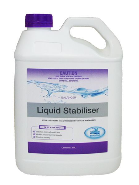 BioGuard Liquid Stabiliser, stabilises chlorine to protect from UV loss. It mixes in water instantly, and can be applied directly into pool water or into the skimmer. Using this product reduces chlorine use and maintenance costs. You can easily apply directly into pool water, or into skimmer and is ideal for all outdoor pools.