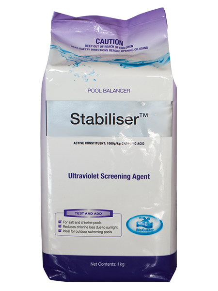 BioGuard Stabiliser is a granular cyanuric acid that prevents chlorine loss due to sunlight. This reduces chlorine consumption, and maintenance costs and is ideal for outdoor swimming pools with nearly all chlorination methods. (*not suitable for use with Brominating Tablets).