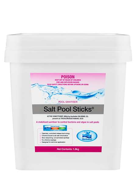 BioGuard Salt Pool Sticks are 225g sticks that dissolve much slower than regular trichlor sticks or tablets when the pump is off and can last up to twice as long. Designed for weekly skimmer application to augment salt chlorination it won't cloud the water and will help maintain stabiliser level and improve salt cell efficiency.