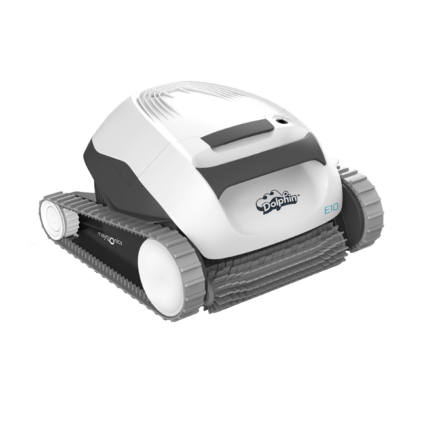 Maytronics Dolphin E10 robotic pool cleaner for pools up to 8m, cleans floor, lightweight, compact robotic pool cleaner with top access filtration system.