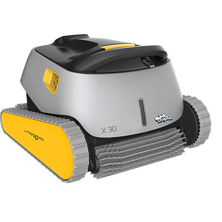 Maytronics Dolphin X30 robotic pool cleaner for pools up to 12m, cleans the floor, walls and waterline. Choose between two filtration options to capture coarse debris or fine dirt.
